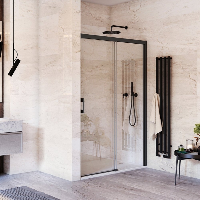 Dušo durys ROTH MELINA MI D2R/1300 juodu profiliu, skaidriu stiklu. Skirta montuoti į nišą arba derinti su šonin sienele MI FX2