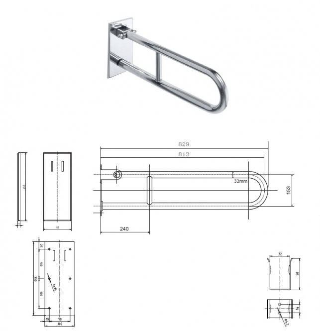 Atlenkiama atrama Bemeta Help 813 mm, su tvirtinimo apdaila, nerūdijančio plieno blizgi