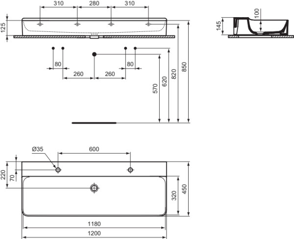 Praustuvas Ideal Standard Conca, matmenys:1200x450x145mm, šlifuota apačia, 2 skylės maišytuvui, be persipylimo