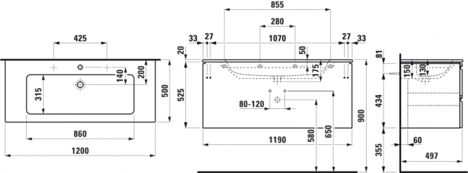 Spintelė su praustuvu Laufen PRO S 1200x500x545 mm, plonas "slim" praustuvas, 2 stalčiai, spintelės spalva - grafito