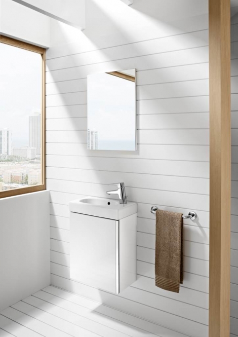 Spintelės, praustuvo ir veidrodžio komplektas Roca MINI 450x250x575 mm, 1 durelės, spintelės spalva - balta blizgi